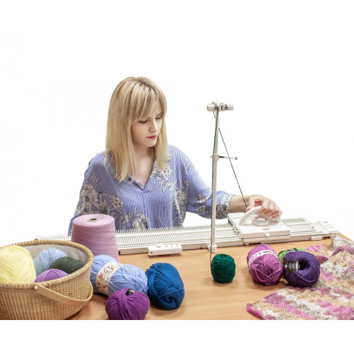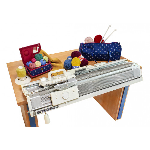 Однофонтурная ручная компактная вязальная машина 4-ого класса. 150 игл. Виды переплетений: цветное прессовое вязание, орнамент, платочное, рельефное, ажурное, ложная английская резинка, лицевая гладь, изнаночная гладь, платировочное переплетение, жгуты, косы...